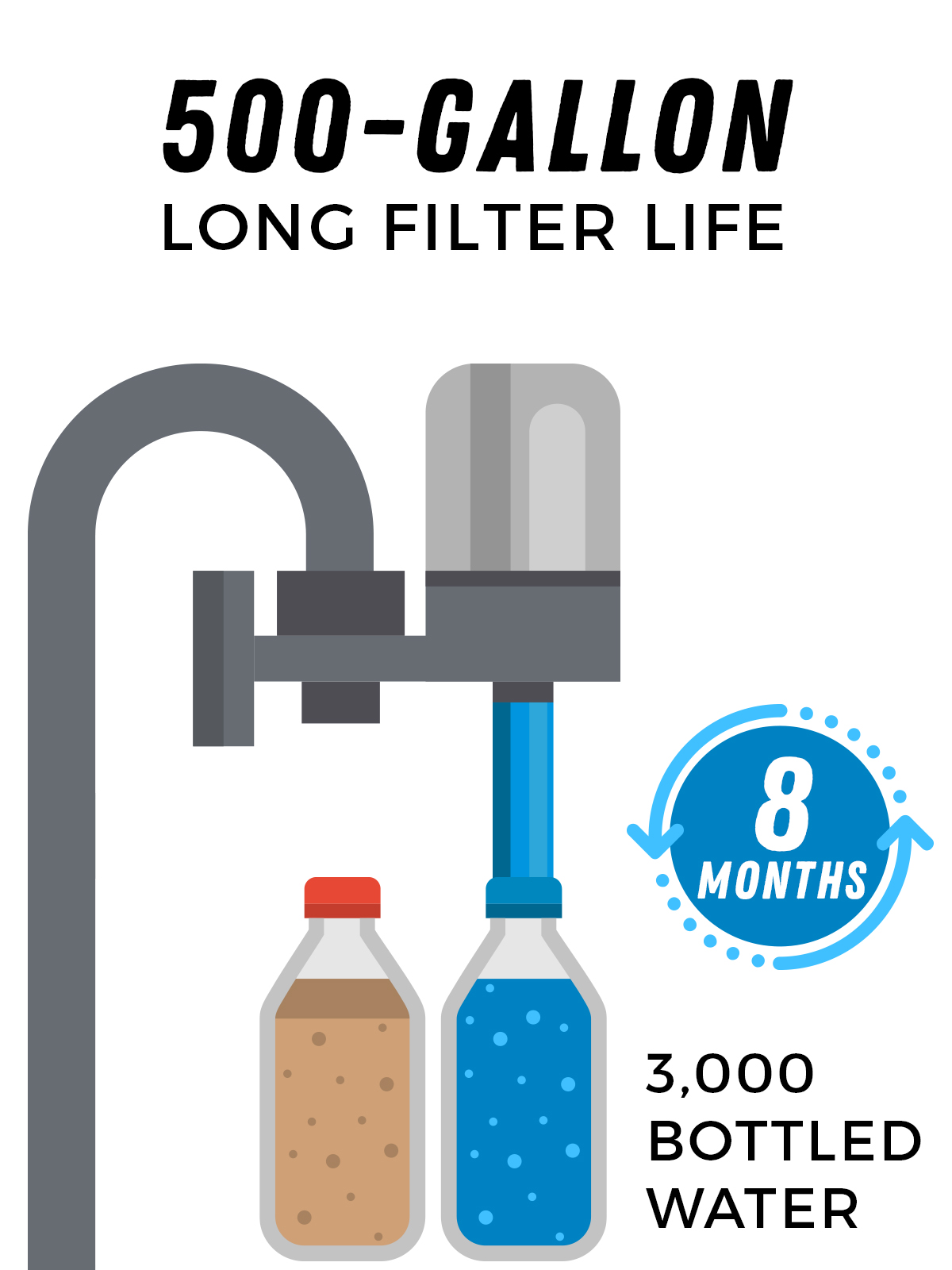 - Thanks to this filter cartridge, iSpring DF1/DF2 series sink water filter faucet can deliver up to 500 gallons of clean filtered water. This means that you will only need to change your faucet water filter once every 6-8 months.
